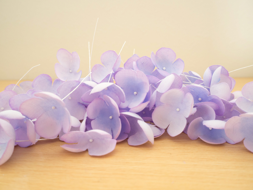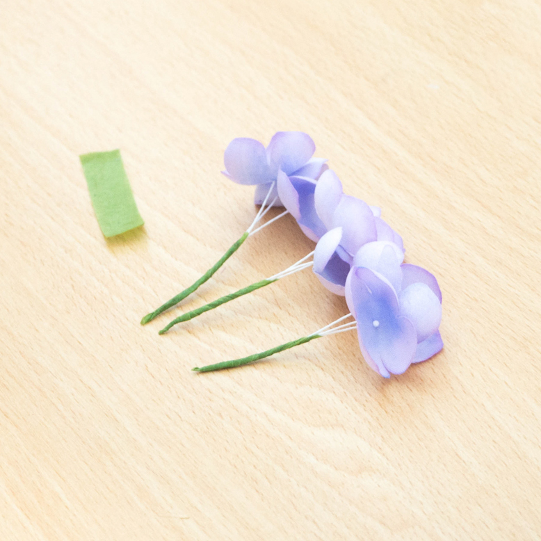 花のまとめ方は色々ありますが、私が紫陽花を作る際は3本ずつをひとまとめにしていきます。