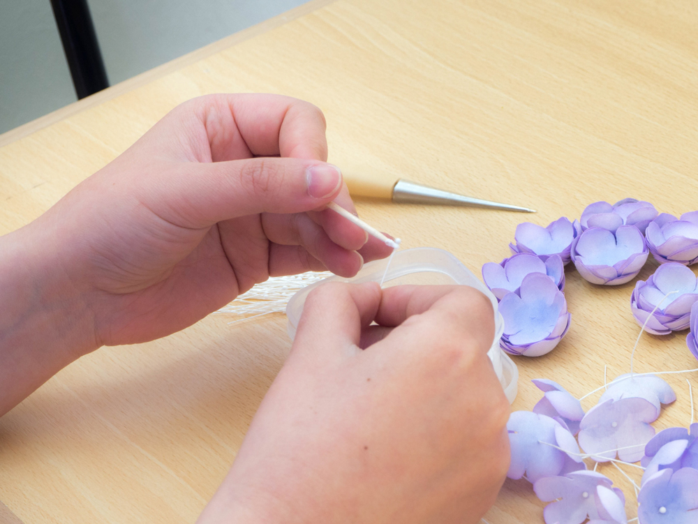 少量のボンドを付けたヘップを穴に通して花びらに固定します。
