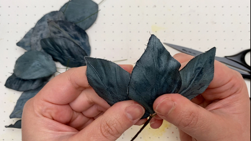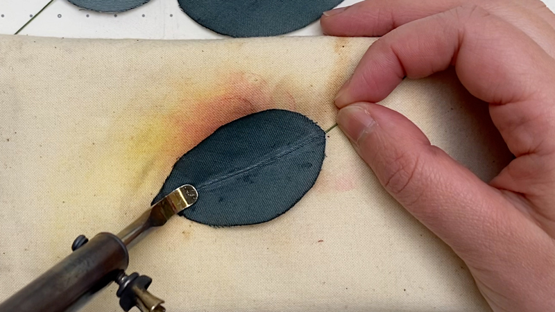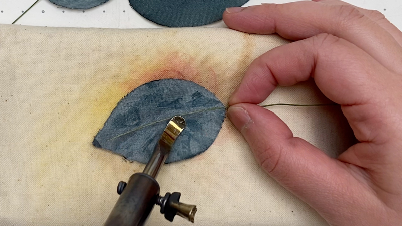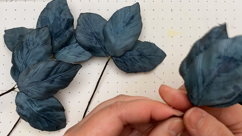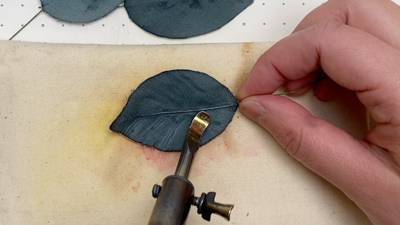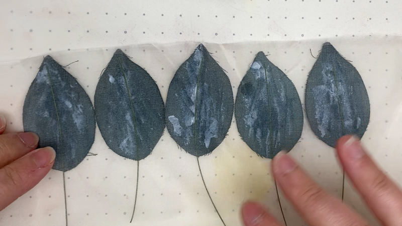 透けるような薄さの布を重ねて貼り付け、葉っぱにします。