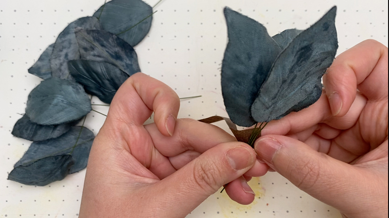 しっかりと乾かした後、葉っぱに針金を貼り付けます。