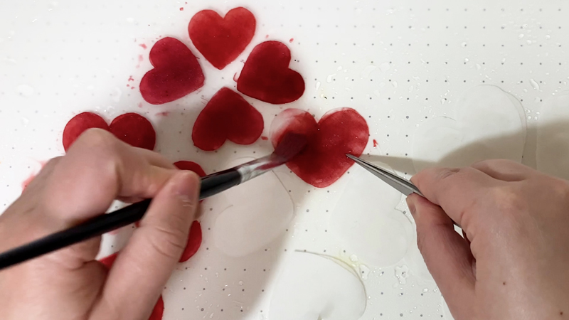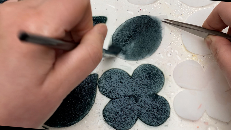 指に染料が付いてしまうと思わぬところに色移りしてしまうことがあるので、ピンセットなどで抑えながら色を乗せていきます。