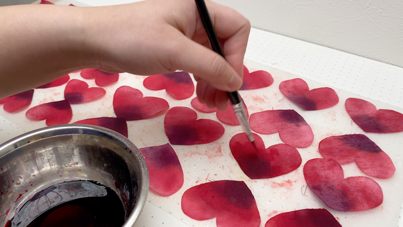 時々裏側を確認して、反対側もしっかり染まっているか確認します。気泡が入ってしまうとムラが出てしまうので気をつけます。