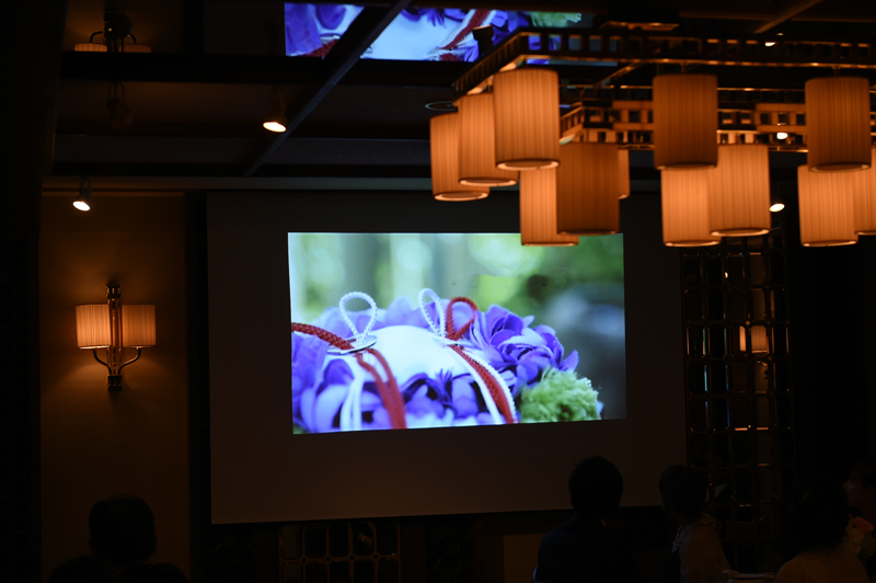 挙式はご本人と家族だけが参加する厳かな神前式スタイル。その様子は、披露宴会場でムービーで映し出されました。